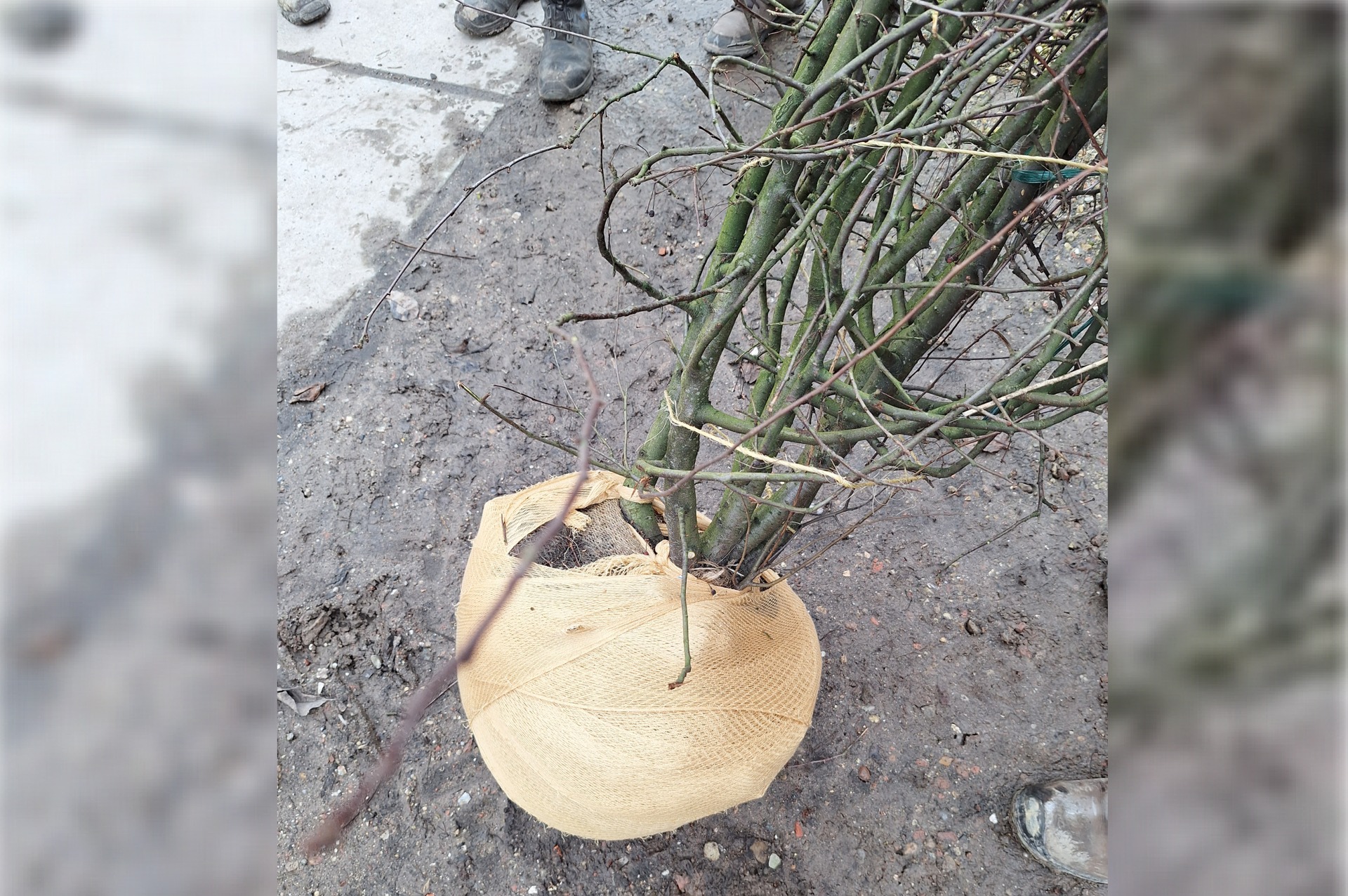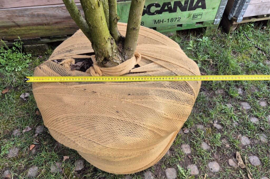 Recently, we did tests at various customers to wrap the rootball of multi-stem trees from containers and open field rootballs. That was a bit nerve-wracking, because wouldn’t the clamp damage the branches?