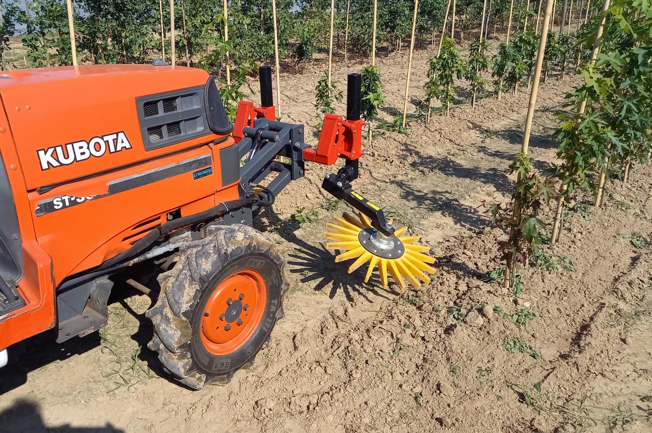 The fingerweeder is a wheel with synthetic fingers which are driven by a toothing at the bottom which grips in the soil. Kress provides fingerweeders with diameters of 37, 54 and 70 cm.
