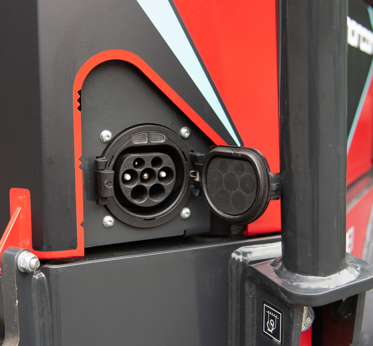 The articulated loader’s lithium battery is simply charged with a standard Type 2-connector at home, at the work site or at charging stations.