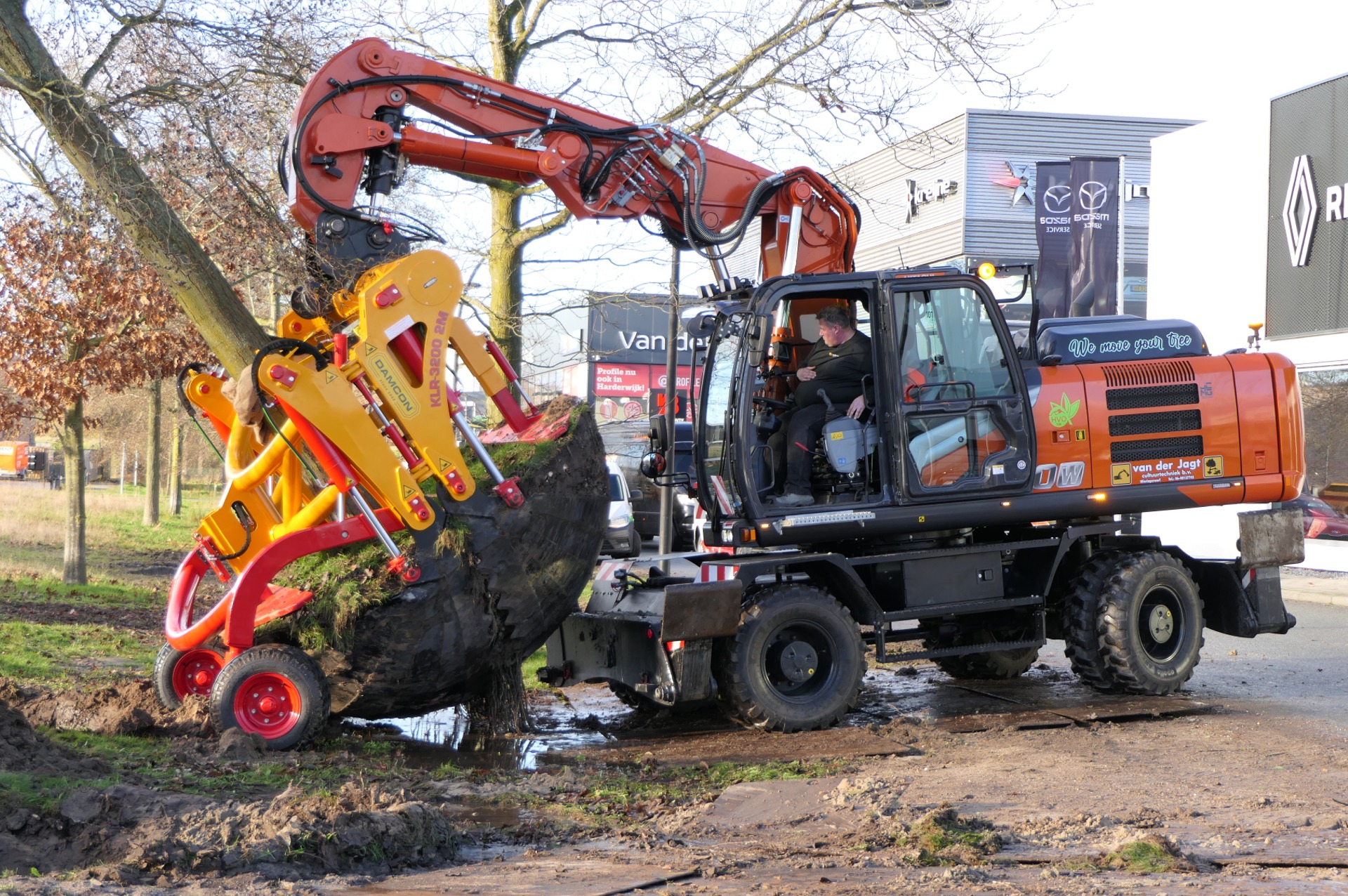 It remains a fascinating sight! Transplanting large trees with a Damcon tree transplanter KLR-3200 2M.
